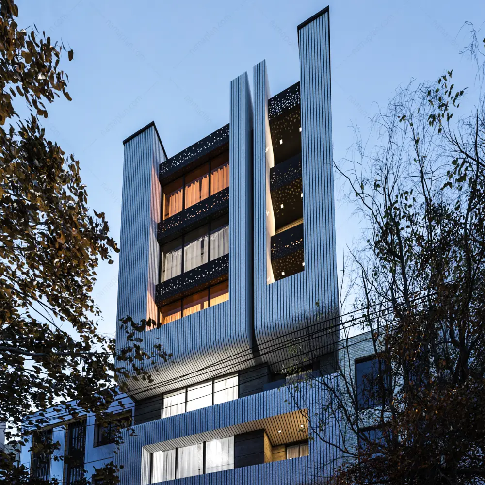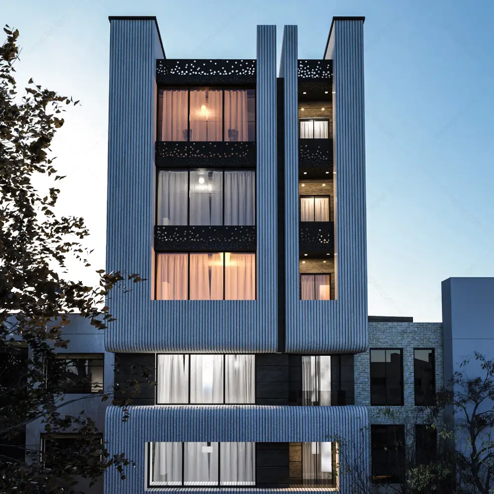 طراحی آپارتمان مدرن. آپارتمان 6 طبقه که در هر طبقه یک واحد مسکونی طراحی شده است. طراحی نمای این آپارتمان بر پایه فرم هندسی باکس و شکل یو صورت گرفته. فرم یو شکل در پیلوت درب کوچک و درب پارکینگ را تشکیل داده است. همین فرم ها در طبقه بالاتر با هم ادغام شده است و یک باکس افقی یکپارچه به وجود آمده. در بالای ساختمان به صورت دو فرم یو شکل برعکس که اشاره به رفیع بودن نما می کند، در تعادل با فرم های پایین قرار گرفته است. این فرم ها به صورت کاذب اجرا می شوند و بین آن ها هم فاصله وجود دارد تا معلق بودن را در عین محدودیت القا کنند. متریال این باکس ها آجر است که با بند های عمودی کارشده است. بین آن ها که کد ارتفاعی طبقات است با ورق های استرچ متال تزیین شده است. پنجره های کشیده و یکسره که دید و منظر خوبی به واحدها داده و نورگیر بسیار مطلوبی هستند. خط آسمان این آپارتمان متنوع است و متریال زمینه و بدنه ساختمان سرامیک های طرح بتن تیره به کار برده شده کنتراست رنگی با آجر رنگ روشن برای حفظ تعادل بصری به نمای آپارتمان بدهد. درب ها و جان پناه های آپارتمان هم با توجه به دیگر عناصر نما طراحی شده اند که در نورپردازی شب جلوه بیشتری از خود نشان می دهند. پلان آپارتمان هم پلان ساده و کارآمدی است. پس از ورودی پلان فضاهای خصوصی و عمومی خانه به دو بخش مجزا تقسیم شده اند که حفظ محرمیت کرده اند. در سمت چپ نشیمن عمومی و آشپزخانه جانمایی شده است. در سمت راست دو اتاق خواب که همگی نورگیر مستقیم دارند طراحی شده است.