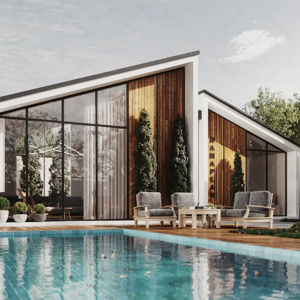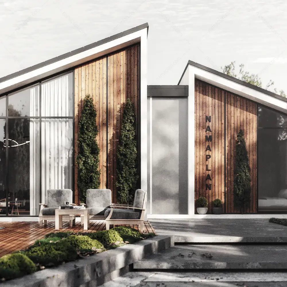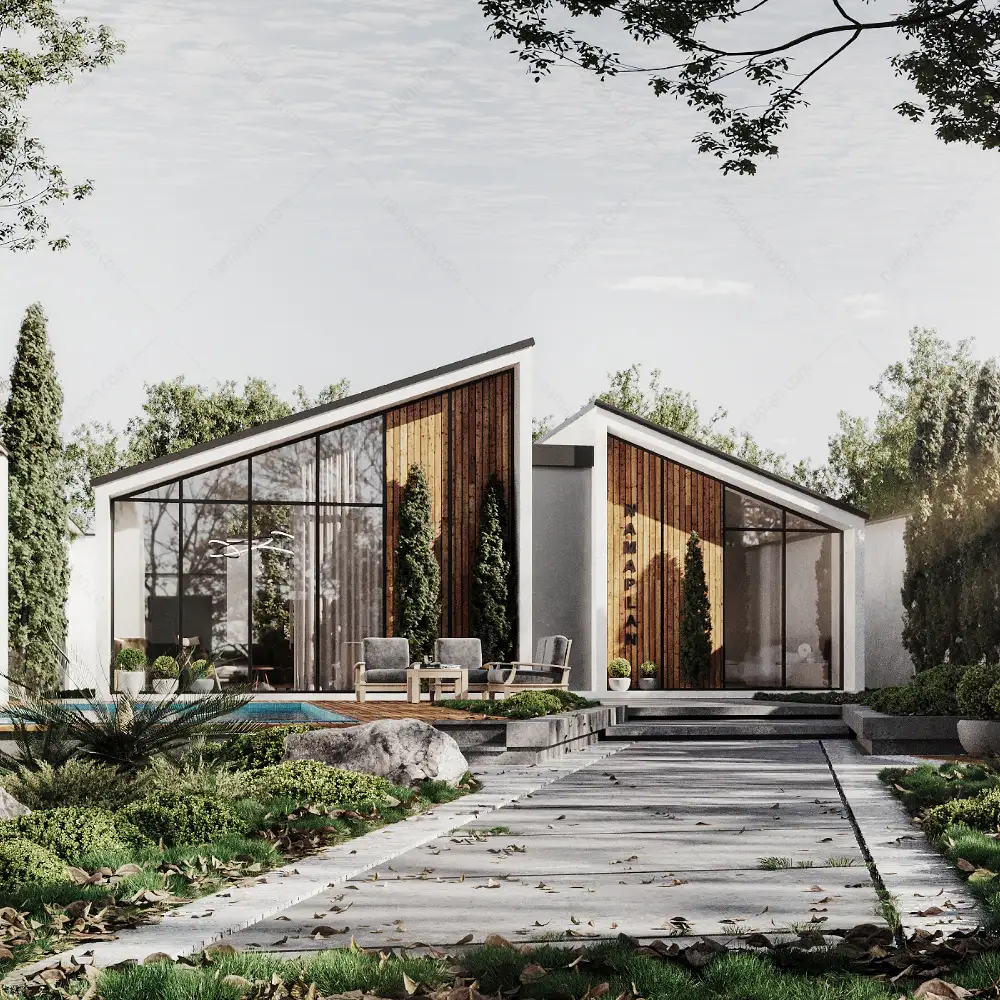 طراحی باغ ویلا مدرن با متراژ 75 متری (با سقف شیبدار) در زمینی به مساحت 500 مترمربع.