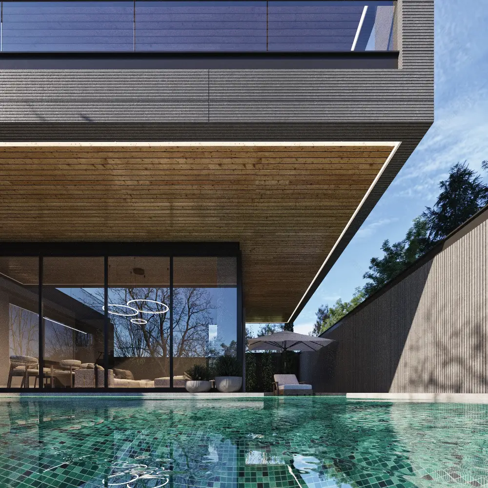 تعامل ویلا با محوطه، استخر و مناظر اطراف به شکلی کاملاً هماهنگ طراحی شده که باعث ایجاد ارتباطی روان بین فضاهای داخلی و خارجی شده است. ترکیببندی و ریخت شناسی فرمی ویلا و روابط فضایی درونی آن با یکدیگر، با در نظر گرفتن حداکثر کارایی و زیبایی، تجربهای هماهنگ و آرامشبخش را برای ساکنان فراهم کرده است. استفاده هوشمندانه از متریالهای مختلف و انتخاب دقیق تکسچرها در کنار کنتراست رنگی (رنگهای گرم و سرد)، با فضای سبز حداقلی ترکیب شده تا فضایی دلنشین و آرامشبخش خلق شود. این ویژگیها باعث شده که این ویلا نه تنها مکانی برای زندگی، بلکه پناهگاهی برای فرار از شلوغیهای زندگی شهری و یک محیط ایدهآل برای استراحت و آرامش ذهنی و جسمی باشد.