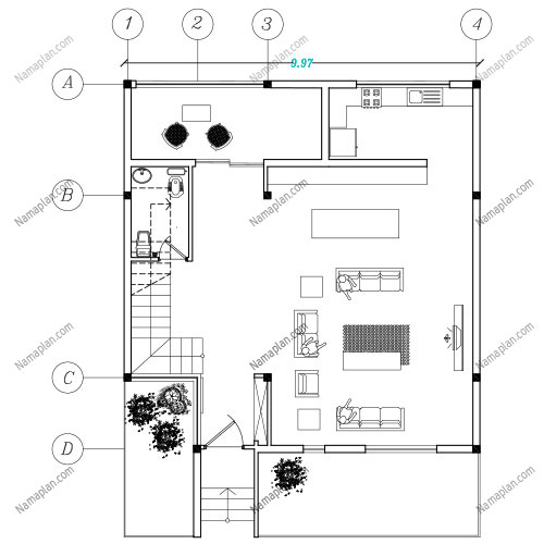در این ویلای دوبلکس مدرن نشیمن با نورگیری عالی روبهروی آشپزخانه طراحی شده و دسترسی آسان به مطبخ دارد. در پشت ویلا تراسی سربسته ایجاد شده تا فضایی مناسب برای گذران اوقات فراهم شود. طبقه دوبلکس ویلا شامل فضاهای خصوصی است و سه خواب، از جمله یک خواب مستر، دارد. این طبقه دارای نشیمن خانوادگی و فضای بار برای سرویسدهی میباشد و تراسی روباز برای لذت بردن از چشمانداز اطراف و پذیرایی از مهمانان در فضای باز فراهم شده است.