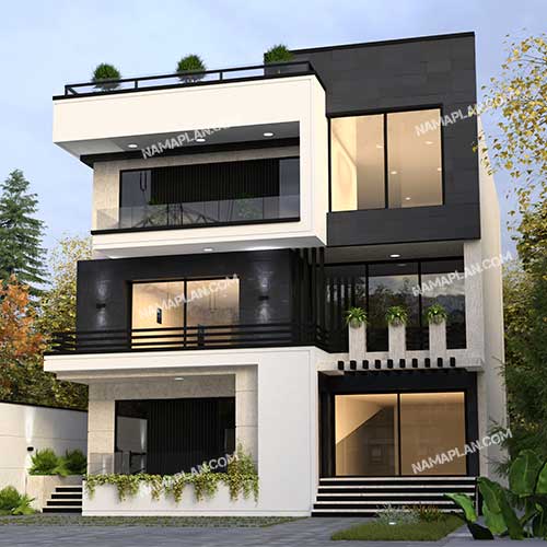 ویلایی تریبلکس با طراحی نمای مدرن که متریال آن سنگ در دو رنگ تیره و روشن است. حجم ویلا به صورت یک پارچه طراحی شده ولی بازی با رنگ سنگها در نمای هر طبقه این حس را به بیننده القا میکند که هر طبقه مجزا از سایر طبقهها میباشد. از نقاط قوت طراحی این ساختمان استفاده حداکثری از بازشوهای عریض میباشد که تهویه و نور خورشید را به خوبی به فضای درون ویلا هدایت میکند. وارد شدن به فضای درون خانه توسط چند پله ممکن میشود که این پلکان سبب عدم نفوذ رطوبت مستقیم از کف زمین به کف داخلی ساختمان میشود.
